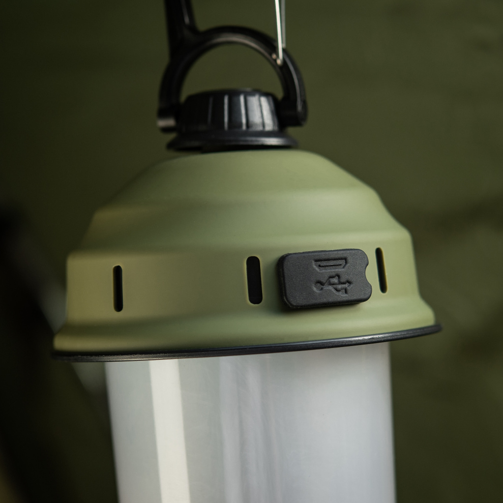 Ліхтар має 3 режими перемикання: яскраве біло-місячне світло, мерехтливий жовтий, що імітує вогнище, і особливий різнокольоровий режим, який створює ефект світлового шоу і додасть святкової атмосфери. Ця модель заряджається за допомогою USB кабелю, який є в комплекті. Micro USB вхід і USB вихід захищені спеціальним клапаном. Також спереду є індикатор, який дозволить вам контролювати запас заряду. Зручний гачок дає можливість повісити ліхтарик і використовувати його в якості стаціонарного джерела освітлення.