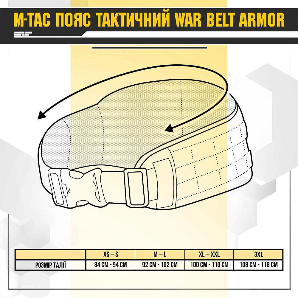 Тактичний пояс War Belt Armor від бренду М-ТАС – невід'ємна складова екіпіровки сучасного бійця. Дана модель надає можливість ефективно комбінувати елементи індивідуального комплекту спорядження, захищаючи при цьому поперек та спину від надмірного навантаження, а у разі встановлення балістичного пакета – від уламків та рикошетів.